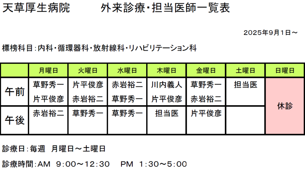 天草厚生病院 外来診療・担当医師一覧表