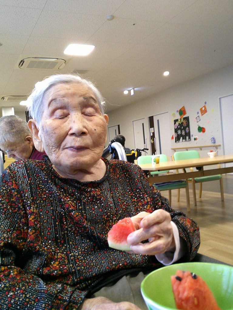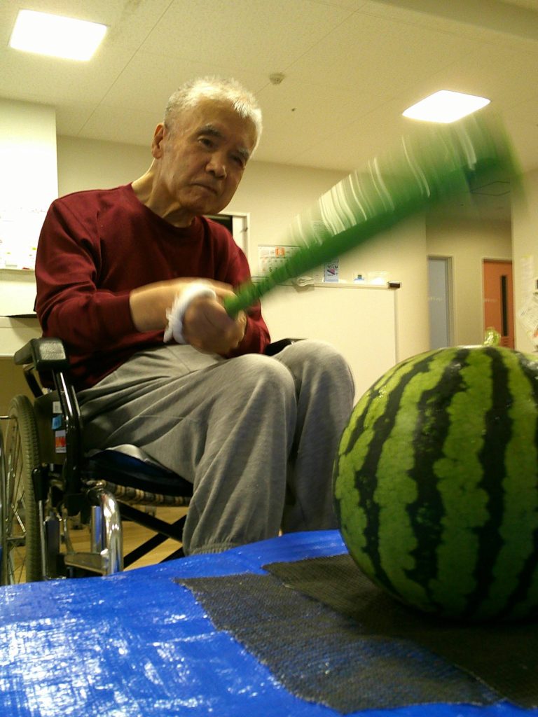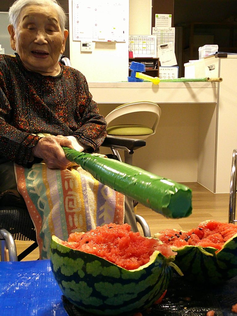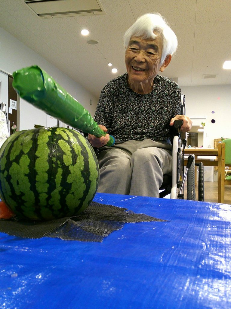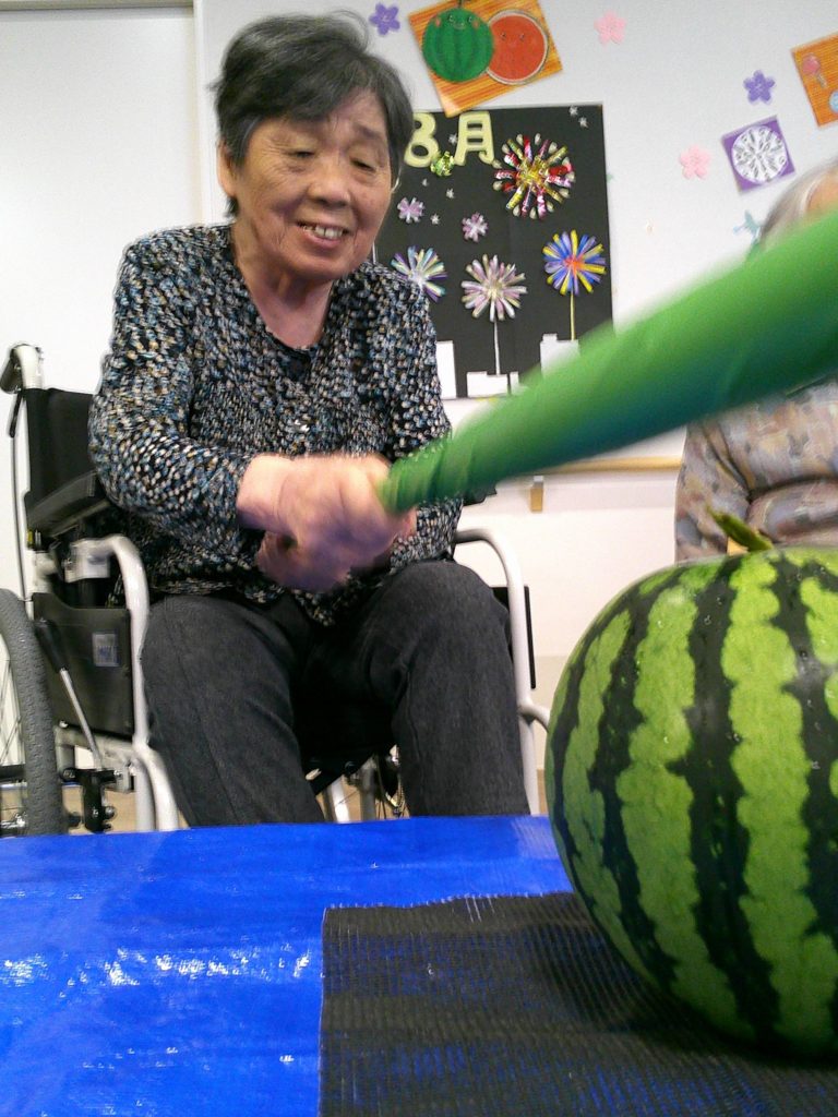 当施設では、開設後より毎年8月には「スイカ割り」を利用者の方に楽しんで頂いております。今年も利用者の方に楽しんで貰おうと実施しました。