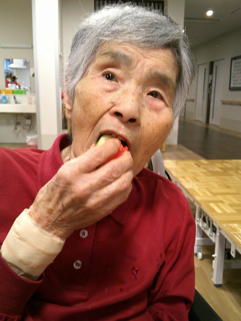 スイカを目の前に竹竿を振り上げ「カッーン」と数発叩き、割れると中から赤々とした果肉と果汁が飛び出し「ヤッター」の一声。利用者も職員も童心に返ったような表情が見られました。スイカ割り後には皆で美味しくスイカを頂きました。