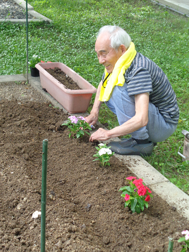 6月6日、少数精鋭の入居者さまと職員で、中庭の手入れを行い、花を植えました。
