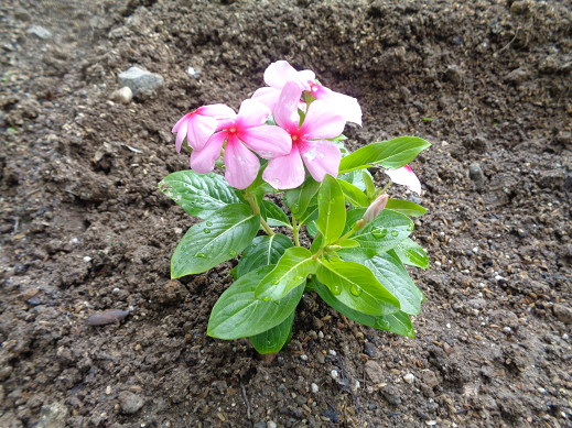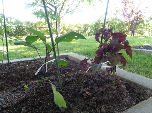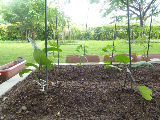 少し前に植えた、夏野菜(キュウリ、ナスビ等)に花が加わったことで、中庭が少し明るくなりました。