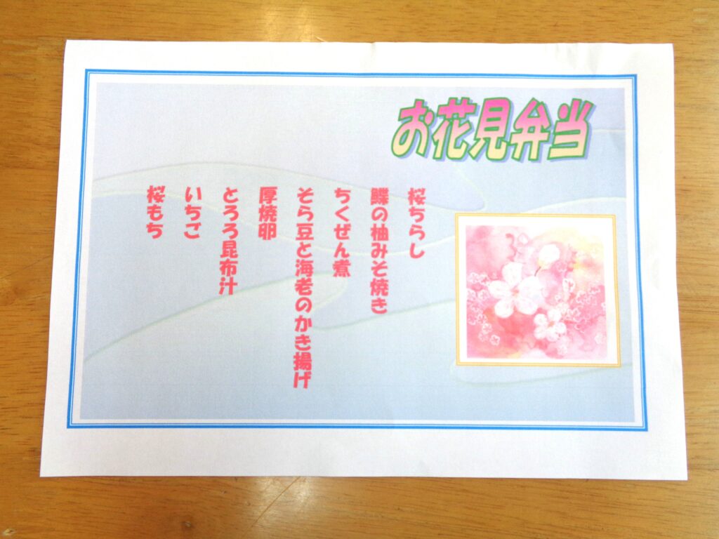 4月1日のお昼に、行事食として『お花見弁当』を提供いたしました。