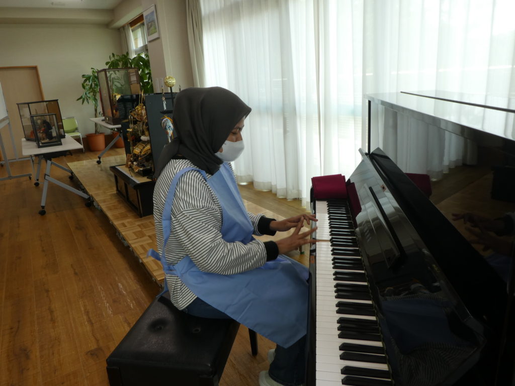 この日、日本食の料理講座に参加していた外国人スタッフが、早速ピアノの前に座り弾き始めました。「ポロン、ポロン♪」と素晴らしい音色を奏でます。