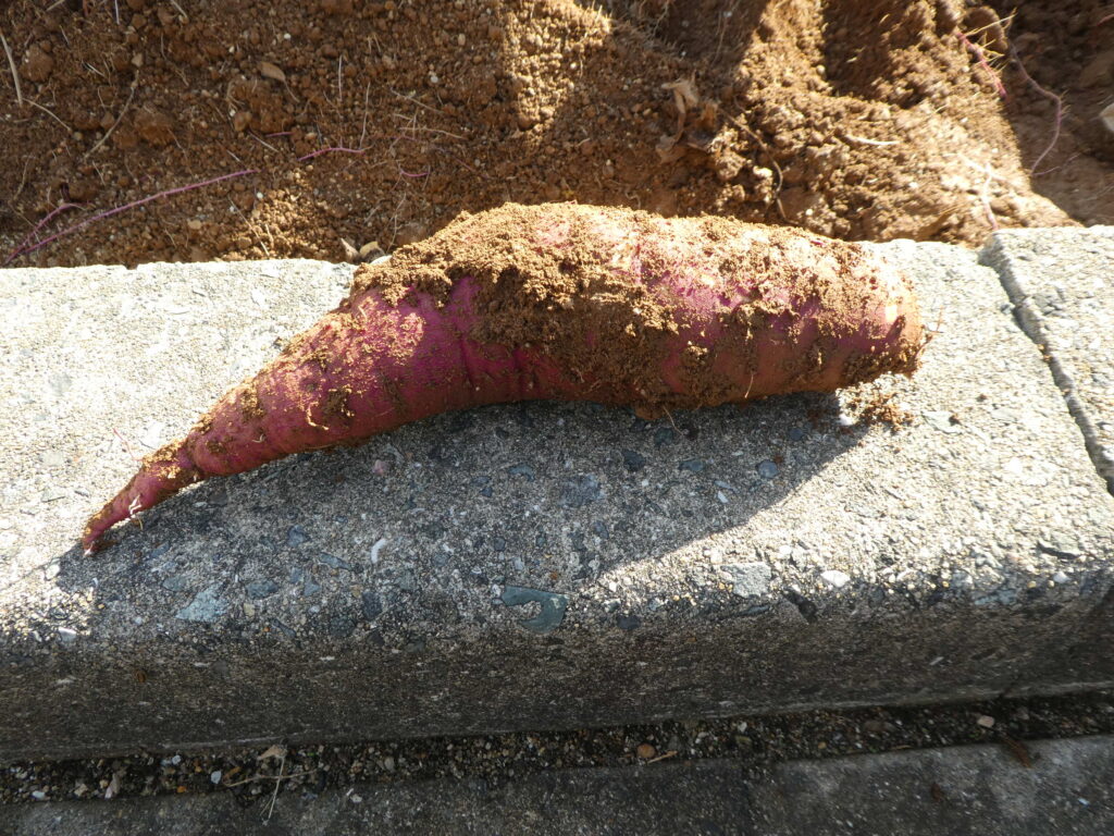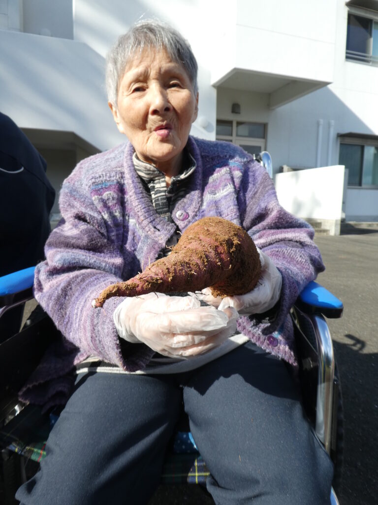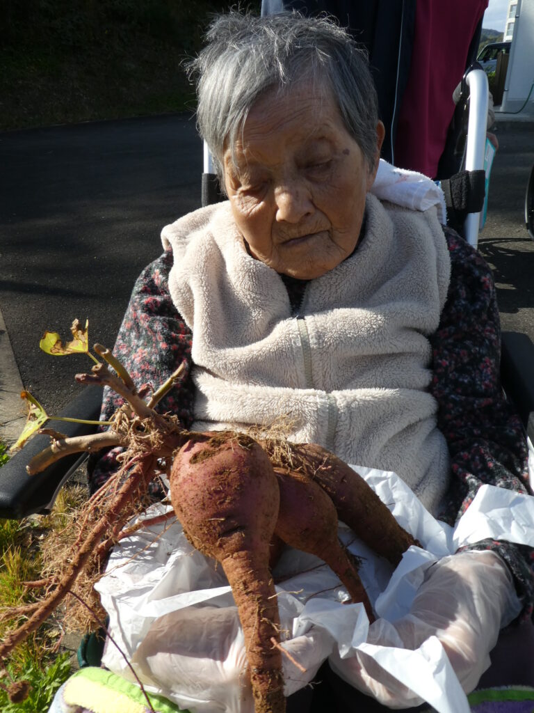 11/27、春に植えたサツマイモの収穫を行いました。風が冷たかったために服を着込んでの参加です。昨年は不作で小さい芋がわずかしか穫れず、少ししか食べることができなかったので、ドキドキしながら掘り進めました。大きな芋が収穫でき、皆さんの手に乗せると、「うわーっ、大きか、重か」、「上等、上等」と大喜びです。今年は思う存分食べることができそうです。おやつ作りも楽しみです。