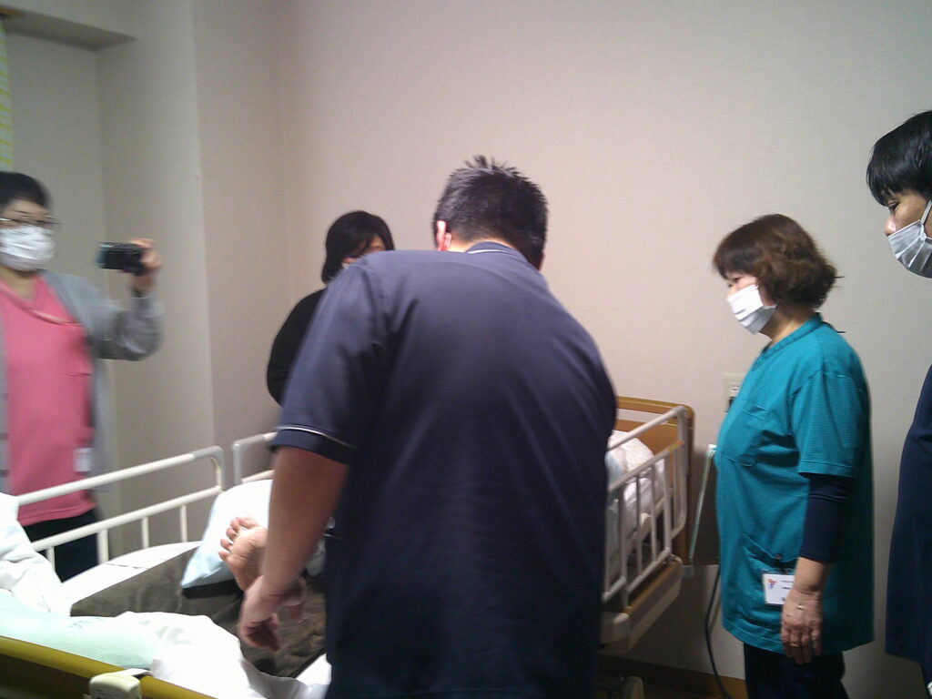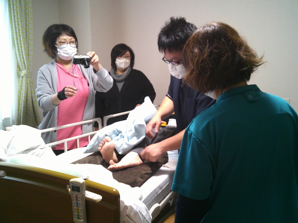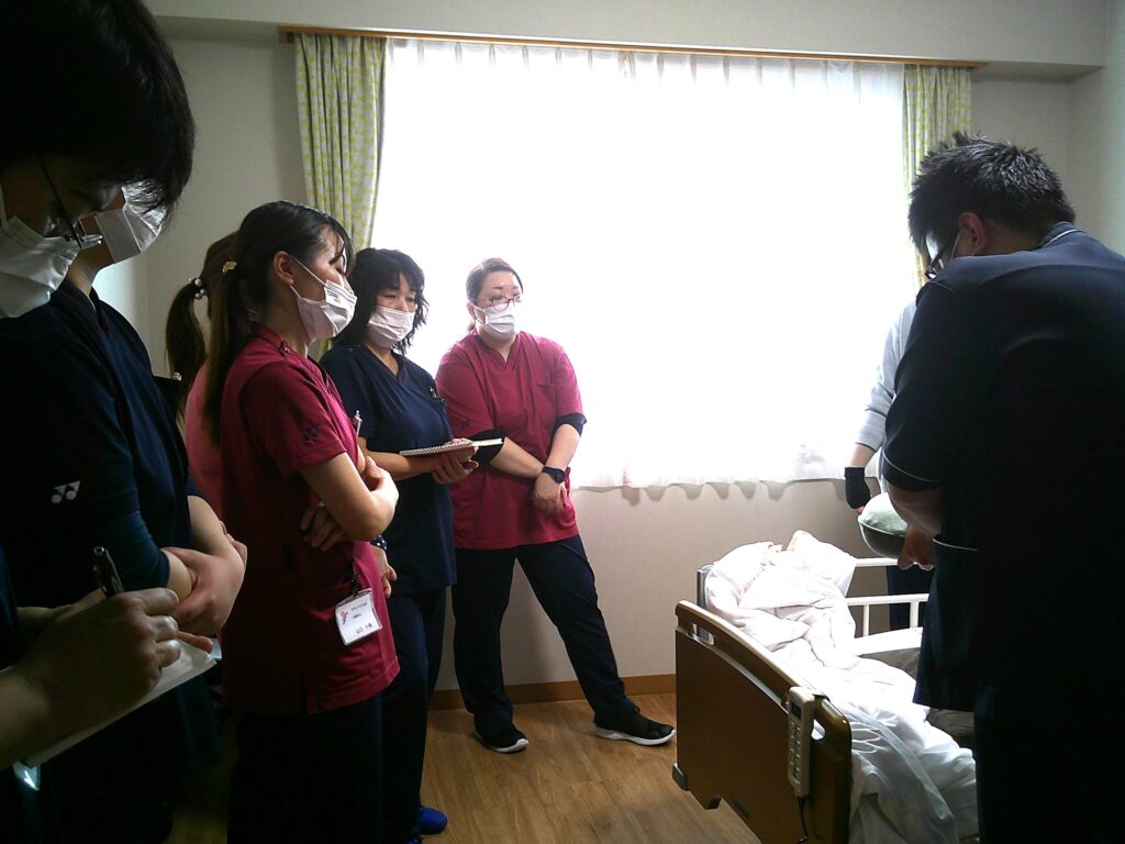 1/20、ポジショニング研修を行いました。サザンテラス五和にはリハビリの専門職がいないため、隣接のブルーマリン天草の理学療法士に講師として協力してもらいました。実際に入居者様のお部屋にお邪魔し、横になられている入居様へのクッションの当て方、身体への触れ方について教えてもらいました。研修に参加した職員の眼差しは真剣そのもので質問も次々飛び交いました。「専門職の実践的な話を聞けて良かった。」「実際に行ってみると〇〇さんの表情がリラックスされ、その人に合わせたポジショニングが大切だと思った。」などの感想があり、大変有意義な研修でした。